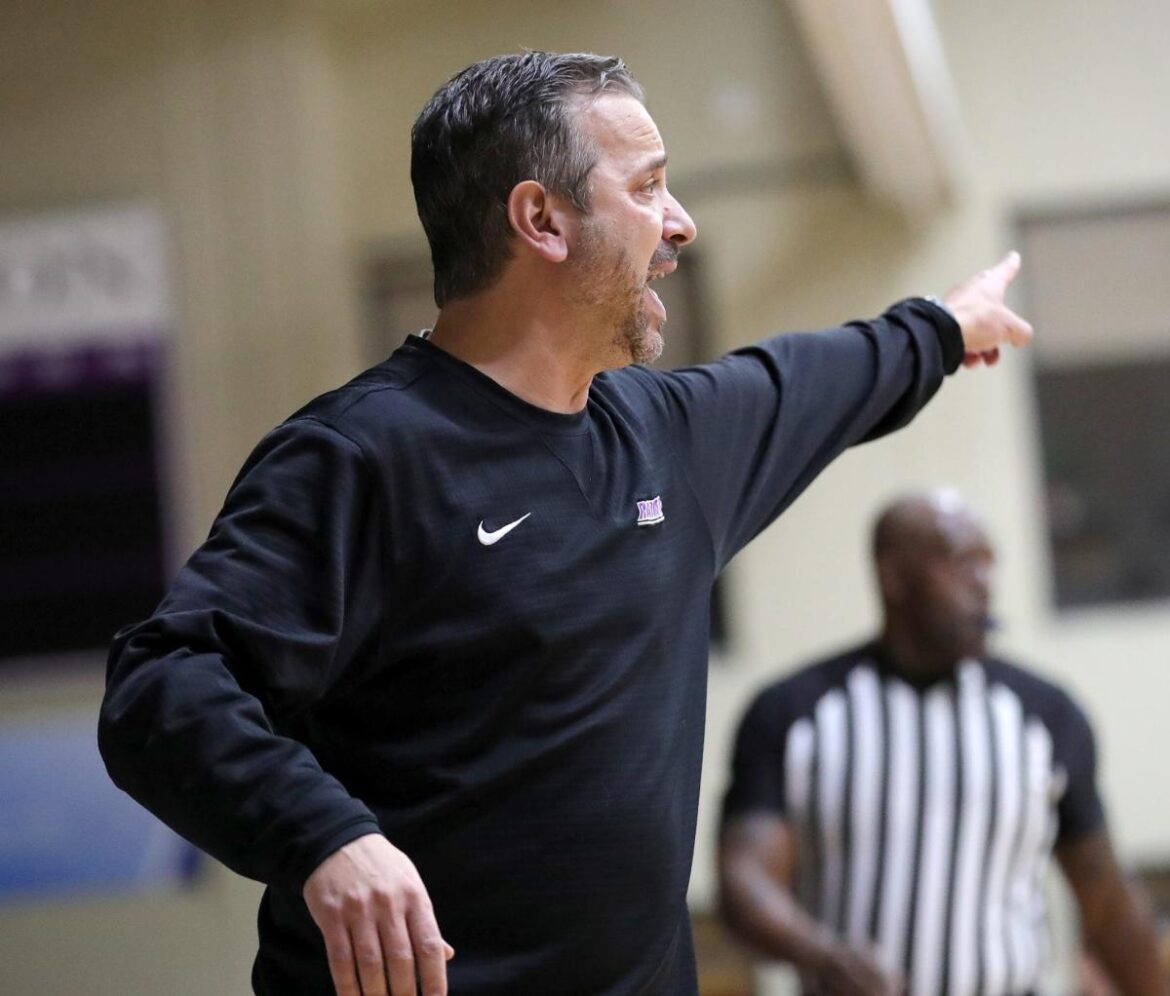 Mount Union men’s basketball head coach Mike Fuline directs his team during last week’s Ohio Athletic Conference Tournament semifinal game against Heidelberg.