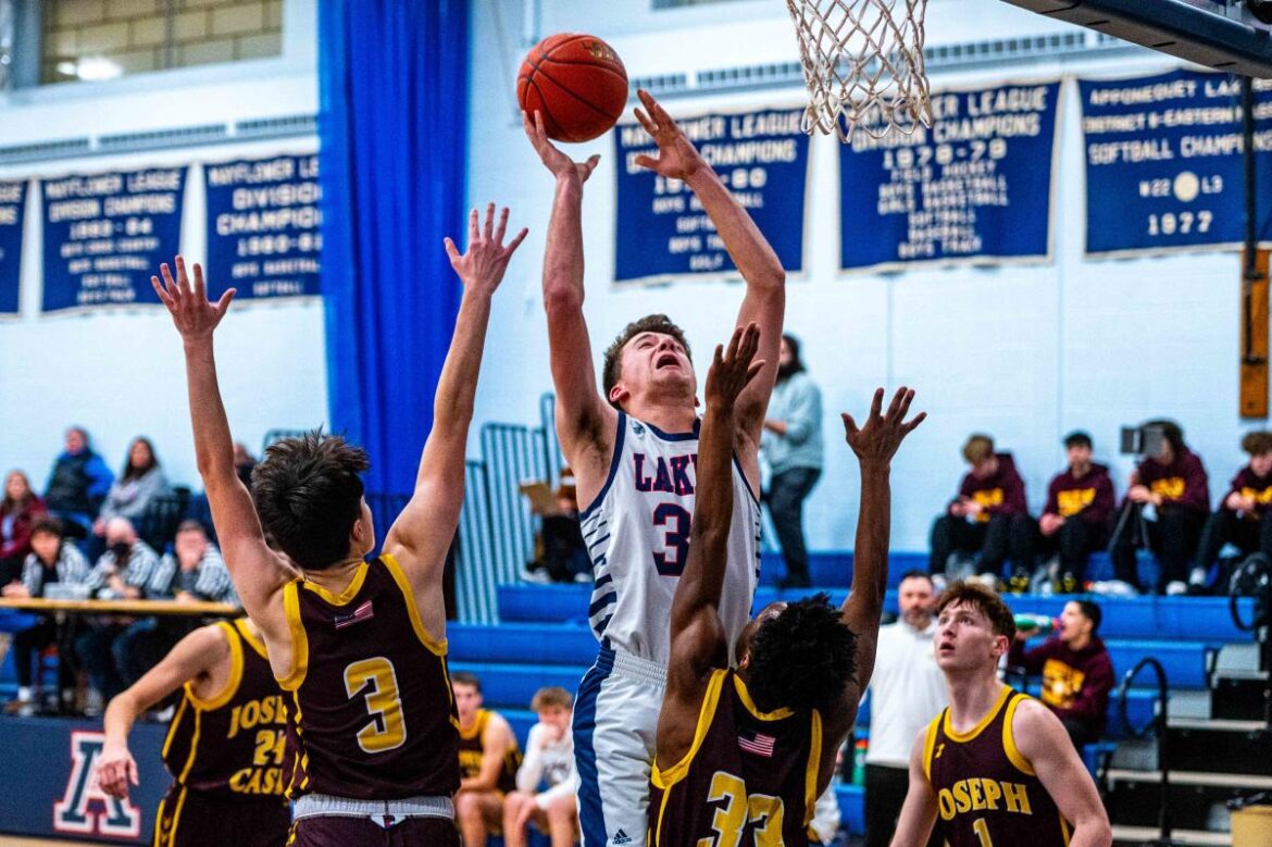 Apponequet’s Nathan Levesque powers his way to the basket.