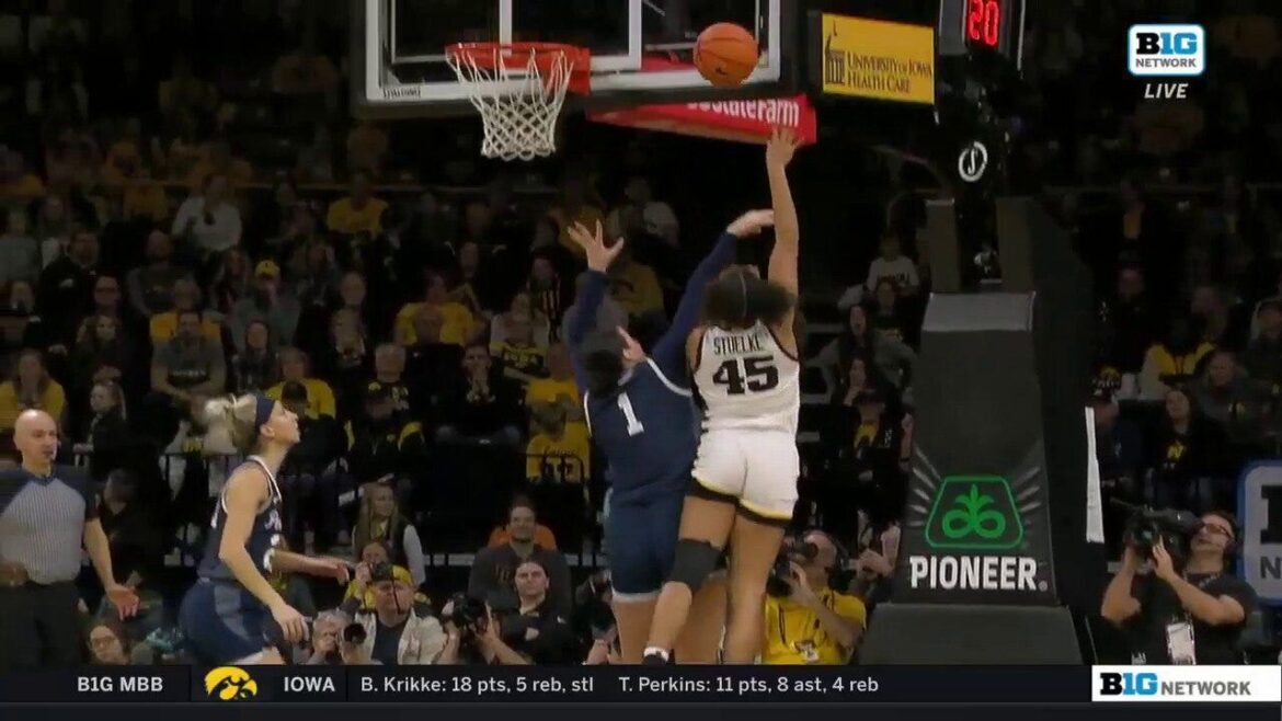 Iowa Hawkeyes’ Hannah Stuelke finished a tough and-1 to finish with 47 points, second most in Iowa history, against the Penn State Nittany Lions