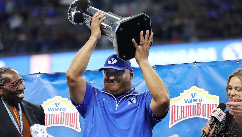 Brigham Young Cougars head coach Kalani Sitake holds the trophy during the Valero Alamo Bowl in San Antonio on Saturday, Dec. 28, 2024. BYU won 36-14. | Jeffrey D. Allred, Deseret News