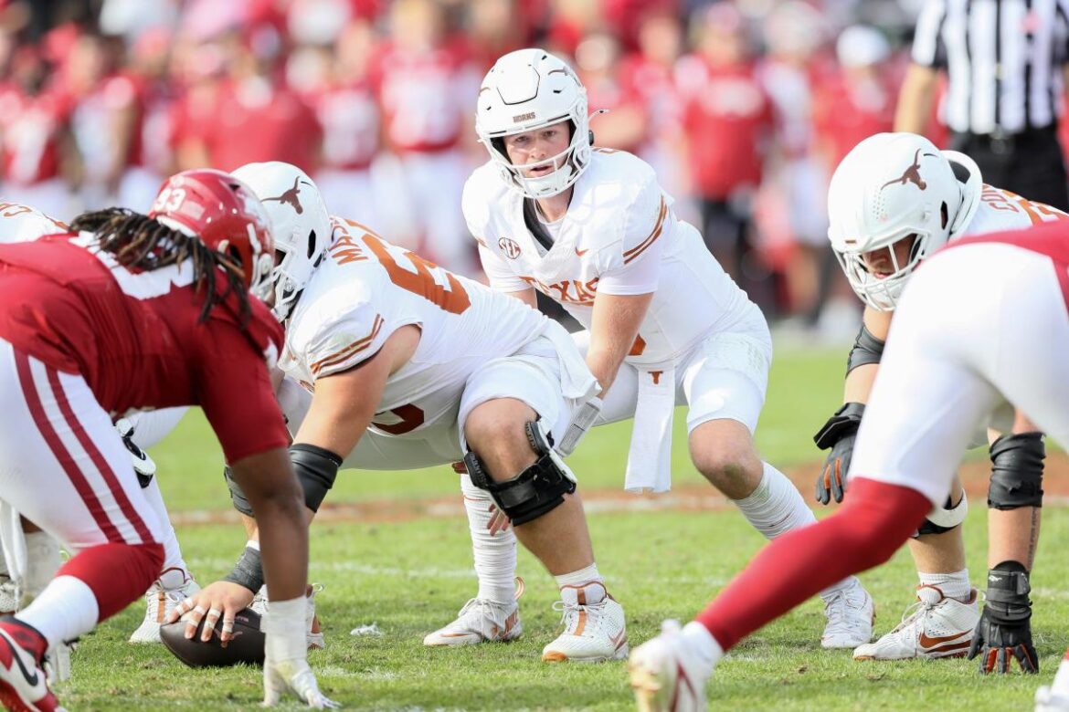 Nov 16, 2024; Fayetteville, Arkansas, USA; Texas Longhorns quarterback Quinn Ewers (3) stands under center during the fourth quarter against the Arkansas Razorbacks at Donald W. Reynolds Razorback Stadium. Texas won 20-10. Mandatory Credit: Nelson Chenault-Imagn Images