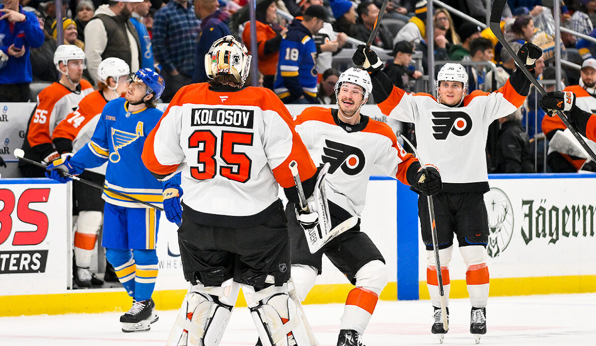 St. Louis cracked Kolosov with 8:49 minutes remaining to draw even at 1-1. Prior to that, Kolosov twice upheld the Flyers’ 1-0 lead with excellent saves on breakaways. The first came on Jordan Kyrou in the final three minutes of the first period and the second on Mathieu Joseph in the opening five minutes of the second period.