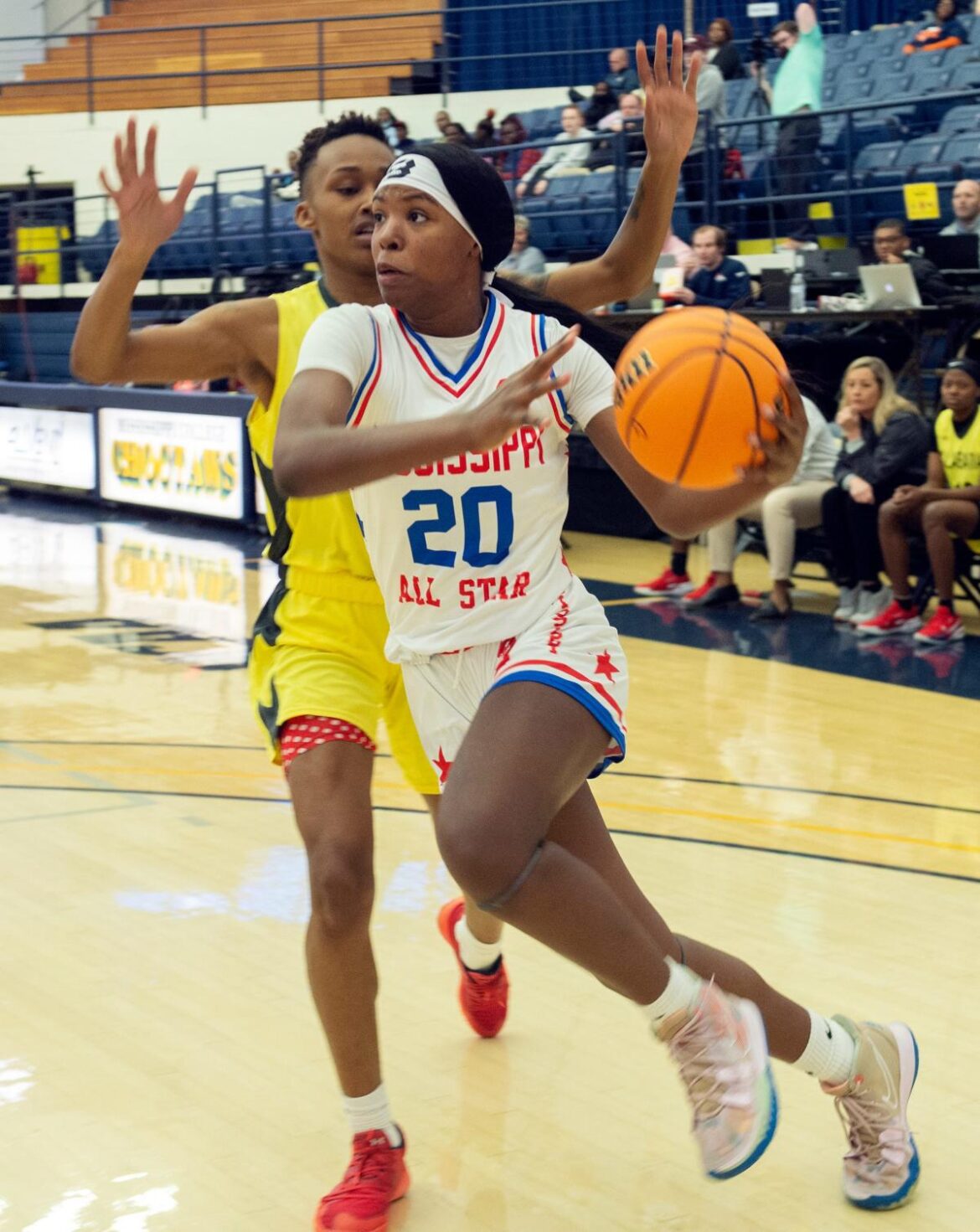Mississippi’s Debreasha Powe of Meridian goes in for two against Alabama’s Shaniah Nunn of Fairfield during the Mississippi/Alabama All-Star game at Mississippi College in Clinton, Saturday, March 12, 2022.