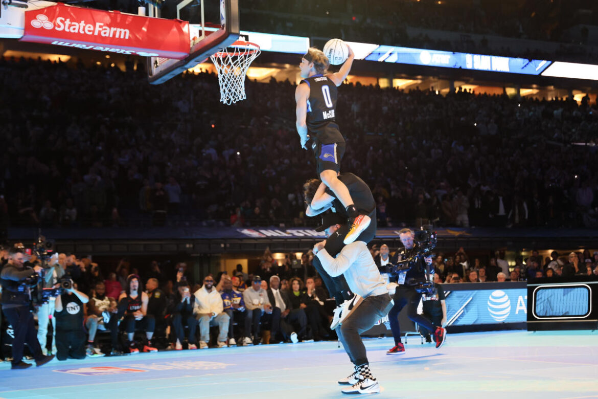 McClung followed a similar script to last year’s victory. He opened the contest by grabbing the ball off someone’s head and tossing it up to himself for the dunk of the night. It was akin to his opener from 2023, when he grabbed the ball from someone’s head in mid-air, tapped it off the backboard and found the net for another statement. The rest of McClung’s attempts followed similar twists on dunks we’ve seen before.