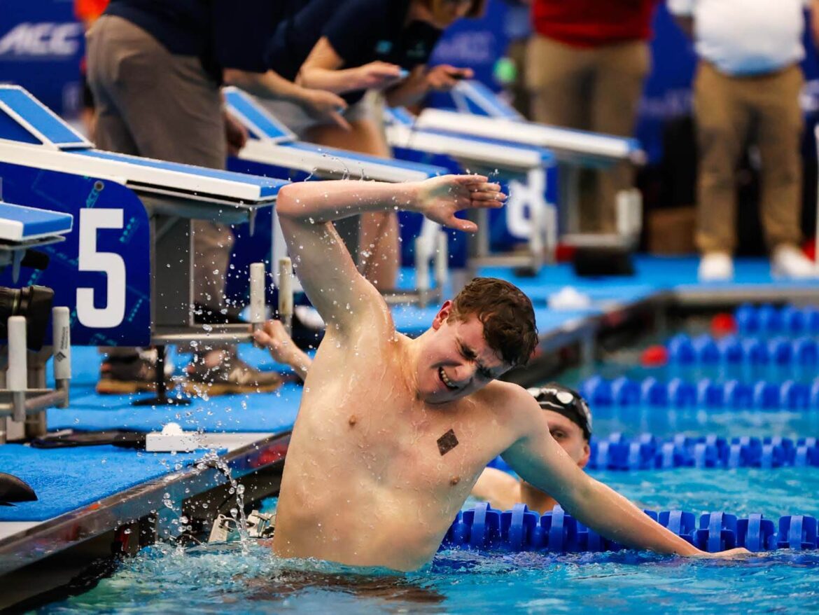 On the final night of the ACC Championships, NC State senior Owen Lloyd out-dueled teammate Ross Dant to win the 1650 freestyle. After battling more accomplished teammates Dant and Will Gallant for the past few seasons, this was a breakout moment for Lloyd, and he celebrated accordingly, climbing on the lane line before falling into Dant’s lane.