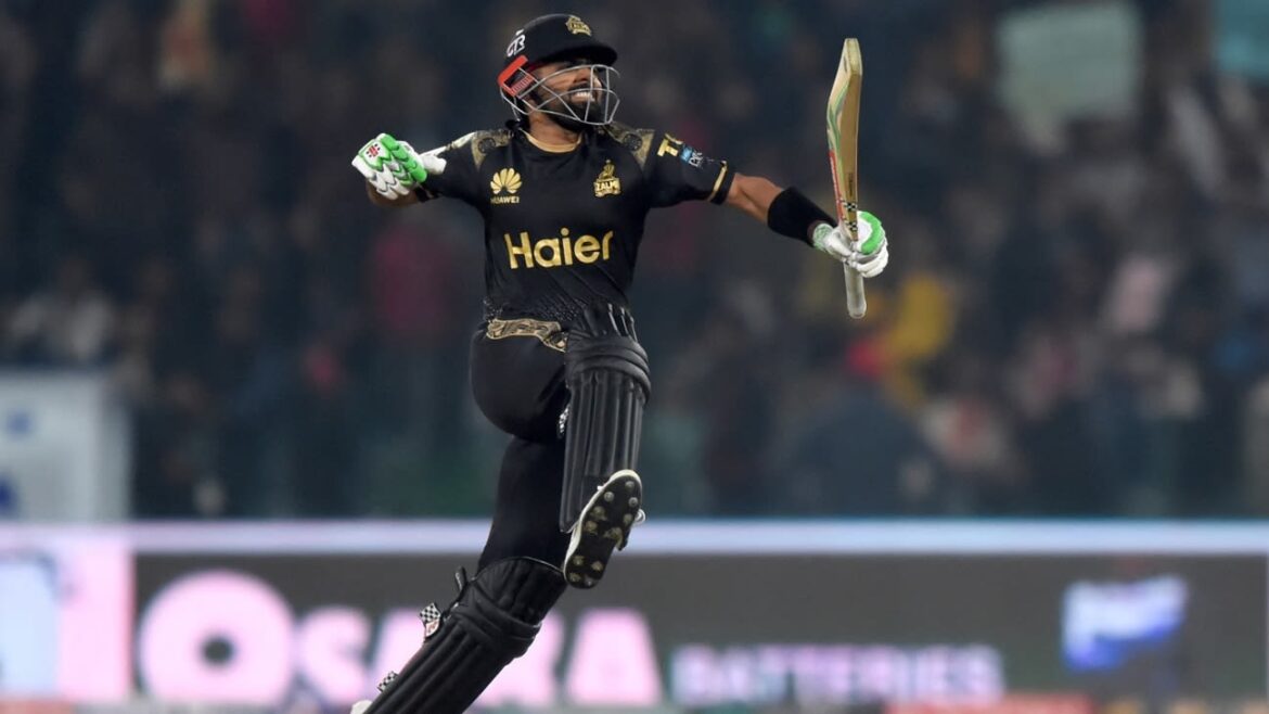 Earlier, after being put in to bat, Zalmi was tied down in the middle overs by spinners Shadab Khan (2 for 28) and Agha Salman (1 for 25) until Babar plundered the faster bowlers. Babar reached his half-century off 39 balls and completed his fastest T20 hundred in the next 20 balls. He smashed fast bowler Hunain for four boundaries and a six over extra cover in one over.
