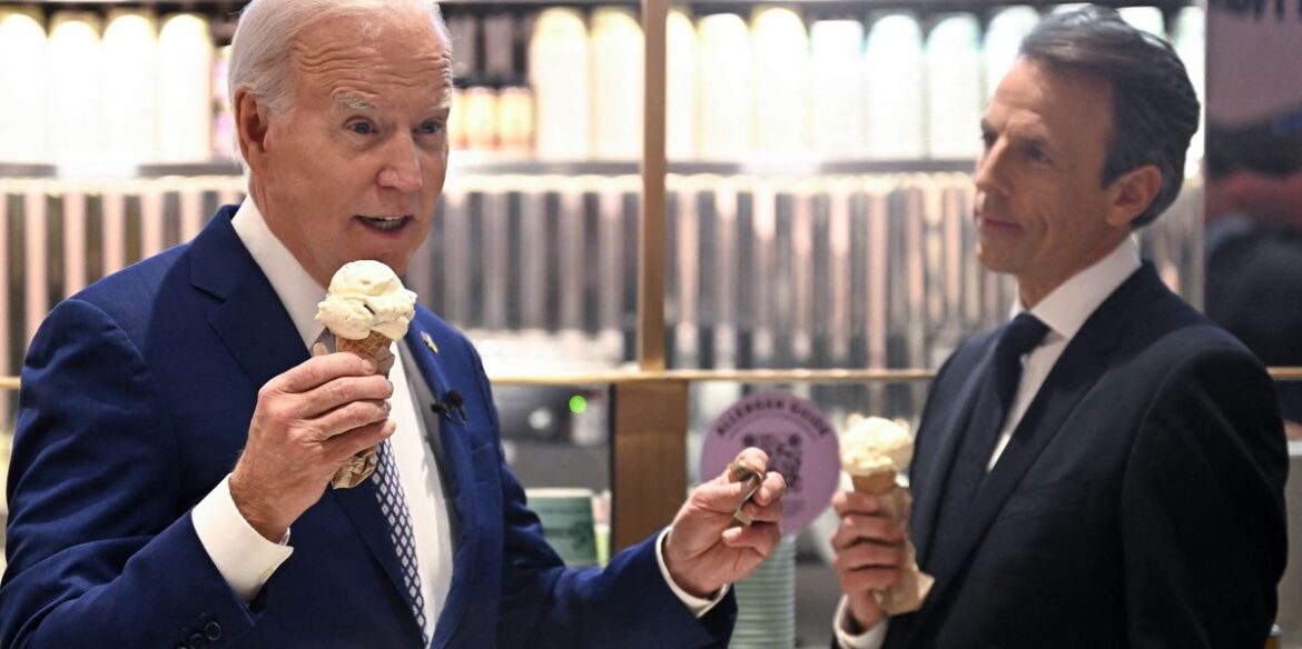 President Joe Biden and Seth Meyers ate ice cream — and became headline news. JIM WATSON via Getty Images