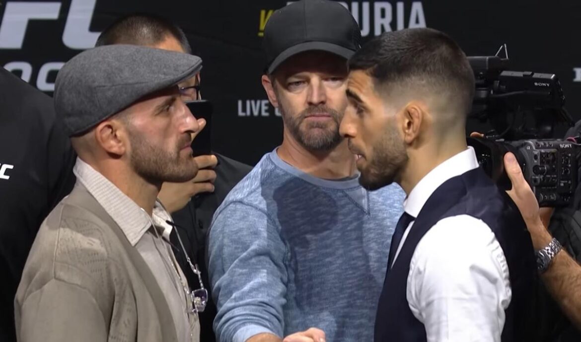 After answering questions from reporters and exchanging words, featherweight champion Volkanovski (26-3 MMA, 13-2 UFC), who came dressed up as an old man, and undefeated challenger Topuria (14-0 MMA, 6-0 UFC) had another intense faceoff where words were exchanged.